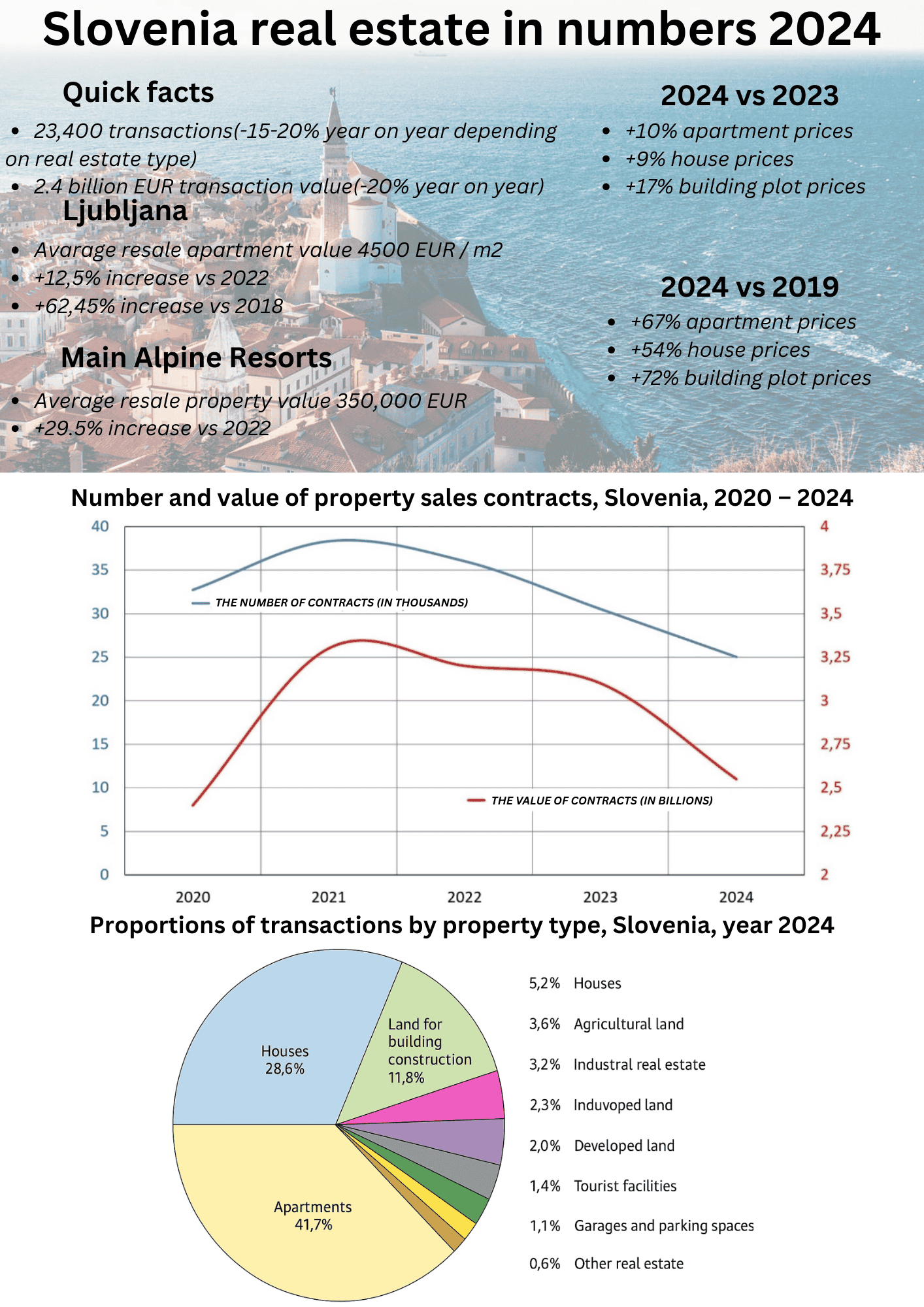 After a period of decline in 2023 and 2024, Slovenia’s real estate market showed a clear turnaround in the first half of 2025. Transaction volumes increased markedly for the first time in three years, while prices continued to rise at a steady pace. Nationwide, the number of apartment sales rose by around 30% compared to the second half of 2024, while house sales increased by about 20%. Sales of building land also recovered modestly, up by around 15%. This rebound is largely attributed to lower fixed mortgage rates, high employment, and real wage growth, which have boosted buyers’ purchasing power. On the pricing side, the upward trend remained stable. In the first half of 2025: Apartment prices rose by approximately 6%, house prices increased by around 4%, and building land prices edged up by about 2% compared to the second half of 2024. At the national level, the median price for existing apartments surpassed €3,000 per m² for the first time, reaching €3,070 per m². In Ljubljana, the median price climbed to €4,890 per m², nearly five times higher than a decade ago, and on the coastal region to €4,760 per m². The median price for houses stood at €180,000, while building plots averaged around €55 per m² nationally, with prime plots in Ljubljana selling for €469 per m². Historically there was a period of prolonged growth in the Slovenian real estate market following the global financial crisis of the late 2000s which had a significant impact on the Slovenian property market which prices reducing 15-20% below pre-crisis levels by 2014 and only returning to their 2008 peak in 2016 and growing steadily until the Covid-19 pandemic. Ljubljana and the leading coastal and mountain resorts remain the most expensive parts of the country to buy in, however in the last few years there has been some flattening of the price differentials between the cheapest and most expensive areas. This said there is still a wide variation in prices charged for similar properties and there are occasional bargains to be found - especially for rural mountain properties - which is why we always recommend our clients let us undertake a bespoke search against their criteria, so they understand the extent of what is on the market that suits their needs. A particularity of the Slovenian market is the relatively low level of transactions per capita meaning that the supply of properties on the market is limited in many areas and property fitting defined criteria can be hard to find. The statistics chart below is based on the last full year Land Surveying Authority (2024) real estate report issued in April for the previous year: