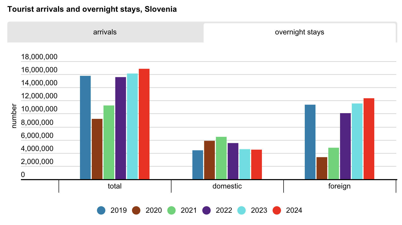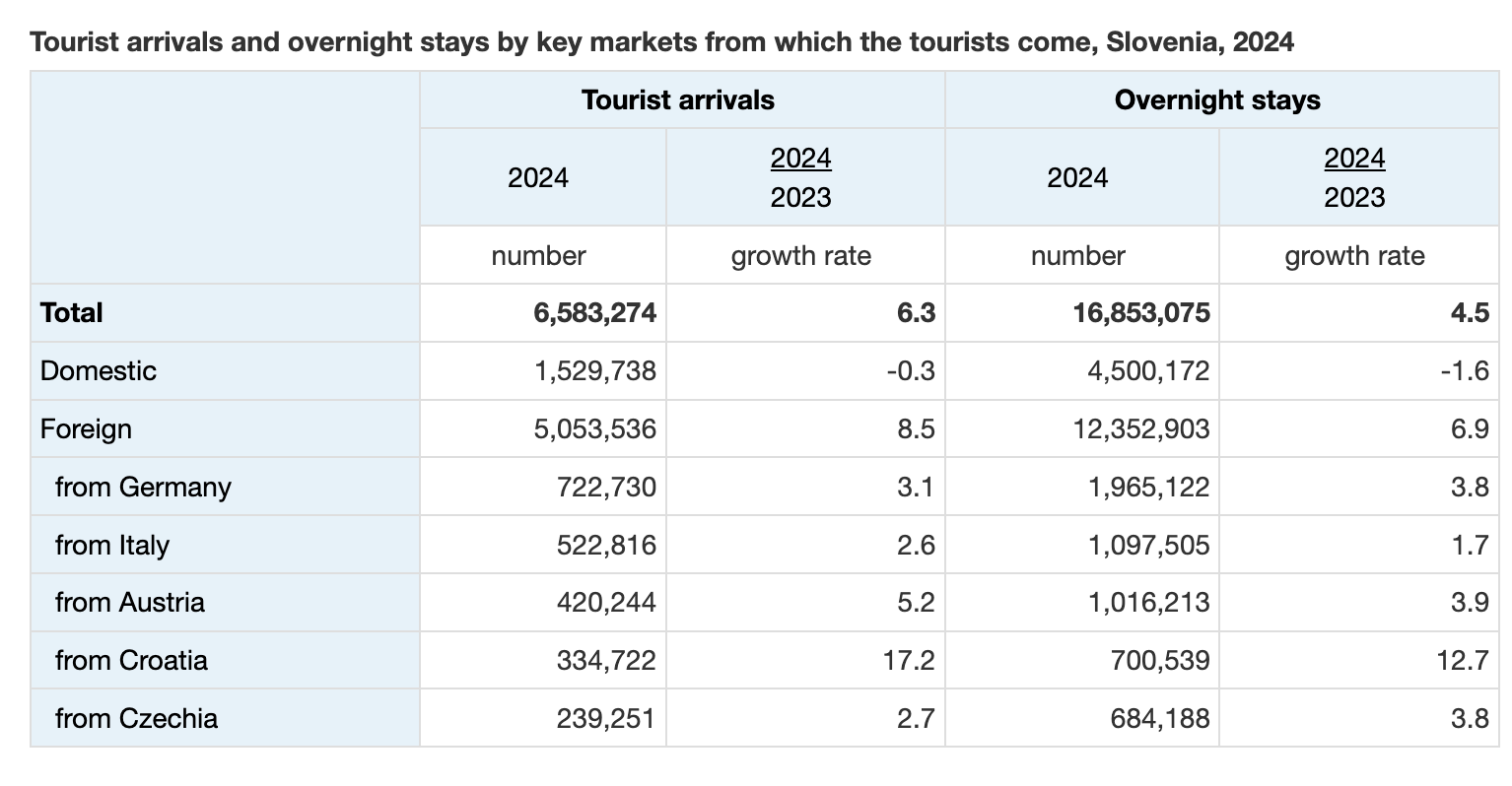 Slovenian tourism experienced its best year yet in 2024, surpassing all previous records. Overnight stays increased by 5% compared to 2023—the previous record-holder—and by 7% compared to 2019. Nearly 6.6 million tourists visited the country, accounting for approximately 16.9 million overnight stays, with August seeing the highest number. The years 2017 to 2019 were previously considered peak years for Slovenian tourism, characterized by substantial growth across various metrics and regions. Tourism has consistently been a bright spot in Slovenia's economy, showing resilience and a steady upward trajectory prior to the pandemic. The resurgence in tourism in 2023 can be attributed to Slovenia's appealing characteristics aligning with current tourism trends, such as green and active holidays. This growth has been bolstered by ongoing improvements in tourism infrastructure, as well as effective promotional efforts by the country and individual regions. This upward trend is particularly relevant for potential buyers of holiday homes in Slovenia, as many tourist areas have witnessed property value increases that outpace market averages. The improving conditions for tourist property rentals further enhance the attractiveness of investing in Slovenian real estate.